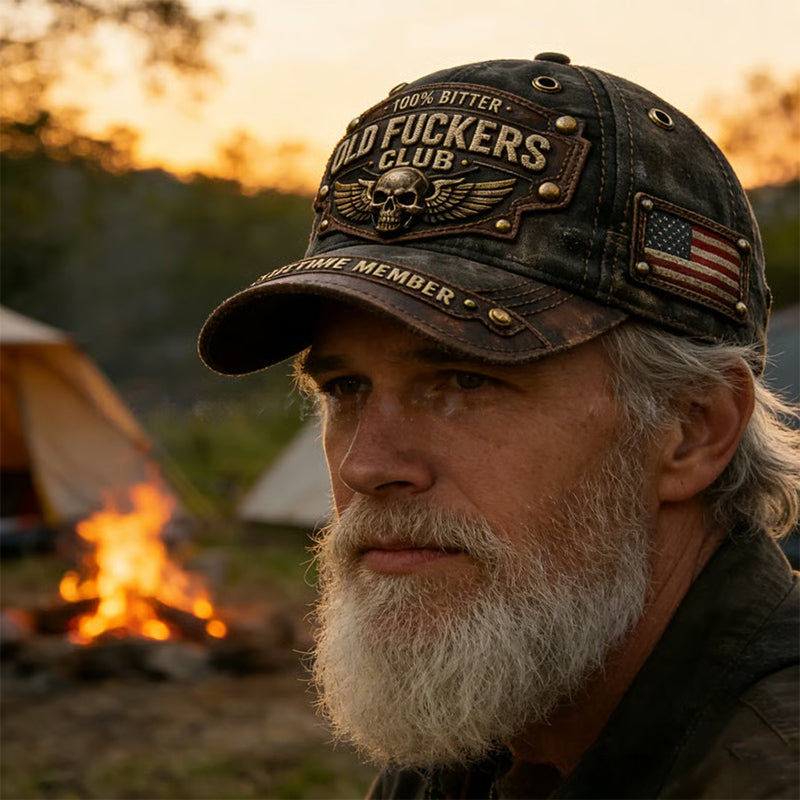 BRODERIES VINTAGE AUDACIEUSES - Affichez votre expérience avec des écussons portant les inscriptions « OLD FUCKERS CLUB », « 100 % BITTER » et « LIFETIME MEMBER ». Cette casquette est un insigne d'honneur qui célèbre une vie bien remplie avec un style assumé et robuste.